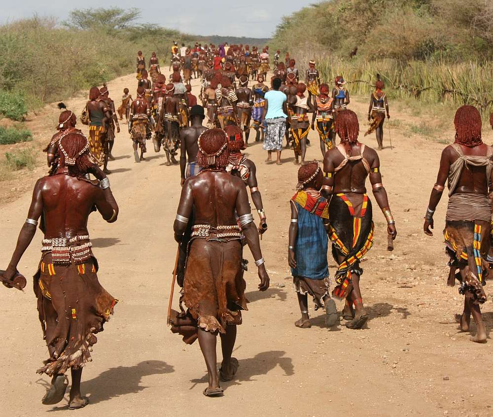 Fahrt durch offene bewaldete Landschaften nach Dimeka, Bezirkshauptstadt der Hamer. Samstags findet hier der Wochenmarkt statt, auf dem die Karo, Hamer, Tsemay, Bena und Ari zusammenkommen, um ihre Waren feilzubieten. Die Karo fallen durch ihre kunstvolle Körperbemalung mit weißer Kreide sowie durch ihre Verzierung mit Schmucknarben auf. Der Volksstamm der Hamer ist berühmt für seinen „Bullensprung“, ein Initiationsritual bei dem ein junger Mann über die Rücken aneinander gereihter Rinder läuft, um so seine Heiratsfähigkeit unter Beweis zu stellen. Im Anschluss an den Markt geht es weiter südlich nach Turmi. Bei Ankunft am späten Nachmittag, Aufschlagen der Zelte am ausgetrockneten Flussbett des Keske Rivers. Abendessen wird stilecht von ihrem Koch auf dem Campingkocher zubereitet. Übernachtung in Zelten.