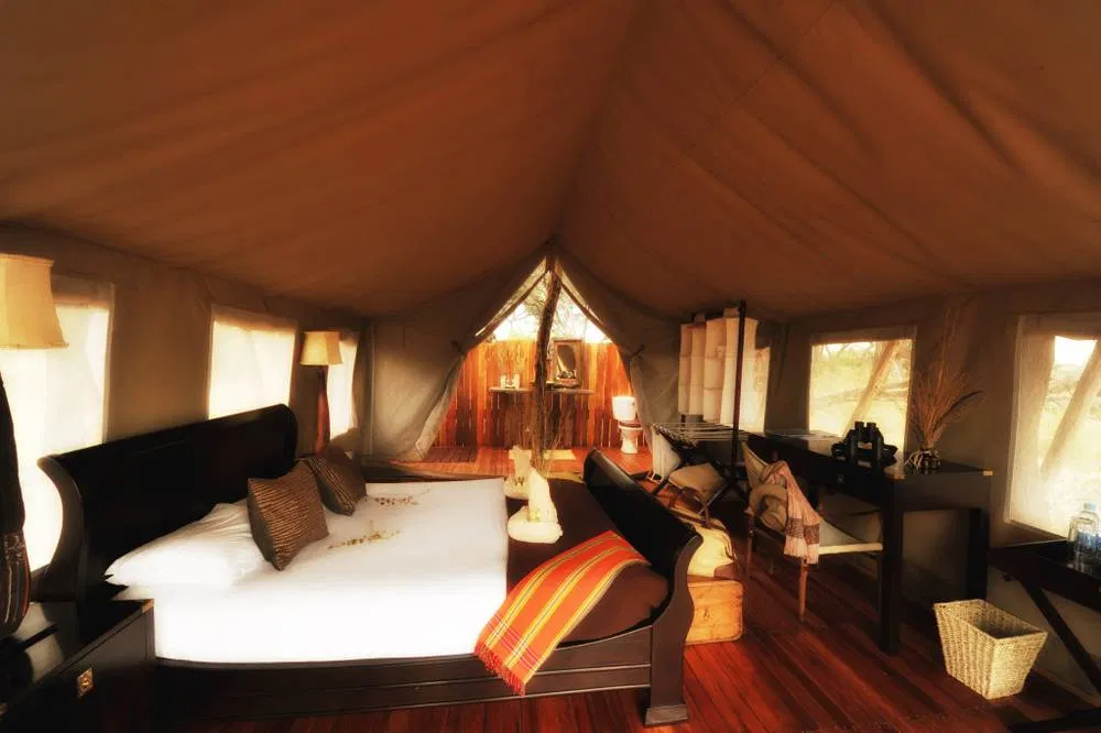 Nur sechs elegant eingerichtete Zelte mit en-suite Badezimmer, Spültoilette und einer romatischen open-air Dusche bilden dieses Camp. Das Dekor erinnert an alte Zeiten, vom Kolonialismus bis hin zu den Stämmen Afrikas, und umspannt Legenden aus allen Ecken dieses eindrucksvollen Kontinents. Das umwerfend gestaltete Hauptgebäude und der Pool blicken auf eine Pfanne, um die sich Wild in rauher Menge versammelt – eine Sternstunde für Tierliebhaber.